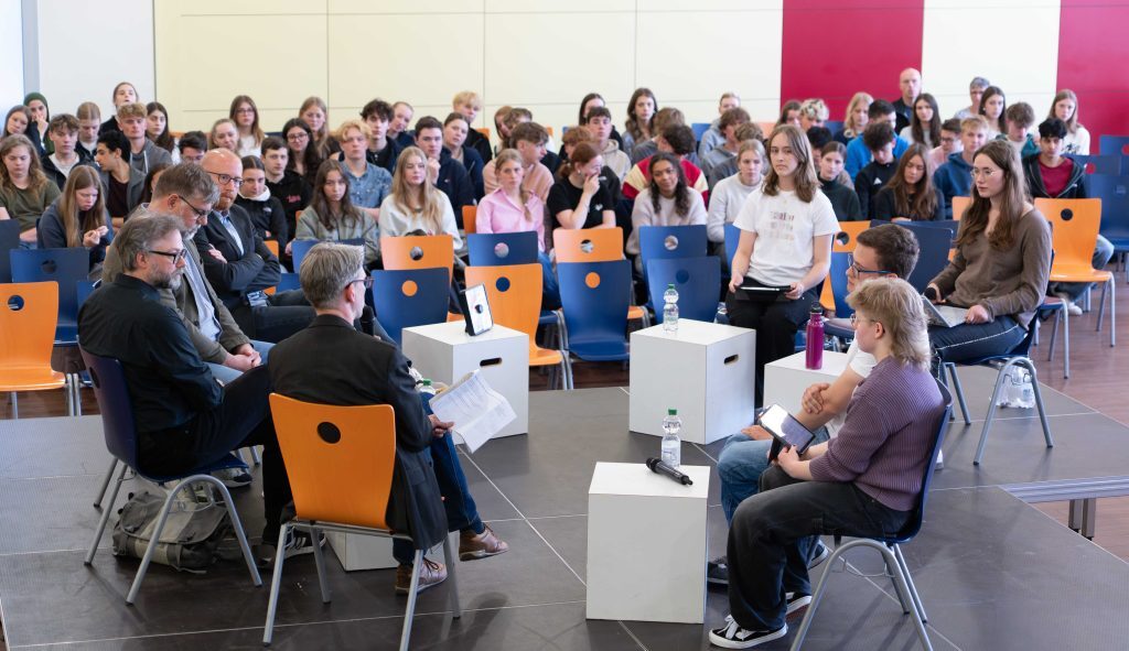 Die letzte Fragerunde leitete die Moderation mit einem Zitat der Holocaust-Überlebenden Margot Friedländer ein: „Schaut nicht auf das, was euch trennt. Schaut auf das, was euch verbindet. Seid Menschen. Seid vernünftig.“ Daraus entwickelte sich die Frage: Wie kann es uns gelingen, vernünftig zu sein, so wie es Frau Friedländer fordert?