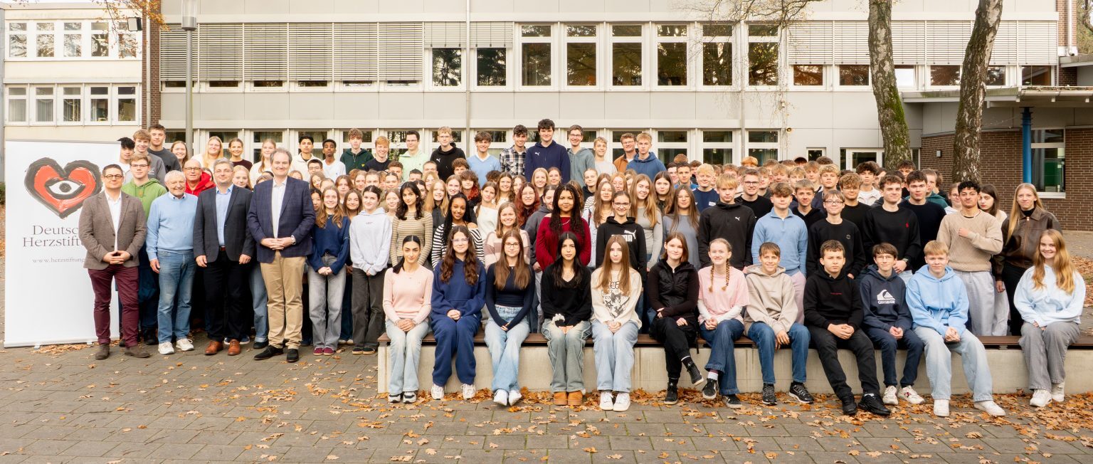 Unter der Schirmherrschaft und mit finanzieller Unterstützung der Deutschen Herzstiftung kann das Projekt Herzensretter in Bronze am Gymnasium Georgianum Lingen für den Jahrgang 10 in Kooperation mit der DLRG Lingen umgesetzt werden. Als Vertreter der Deutschen Herzstiftung waren Prof. Dr. Pott und Herr Hermann Hesse, Ehrenamtlicher Beauftragter Deutsche Herzstiftung für das Emsland und die Grafschaft Bentheim, eingeladen.