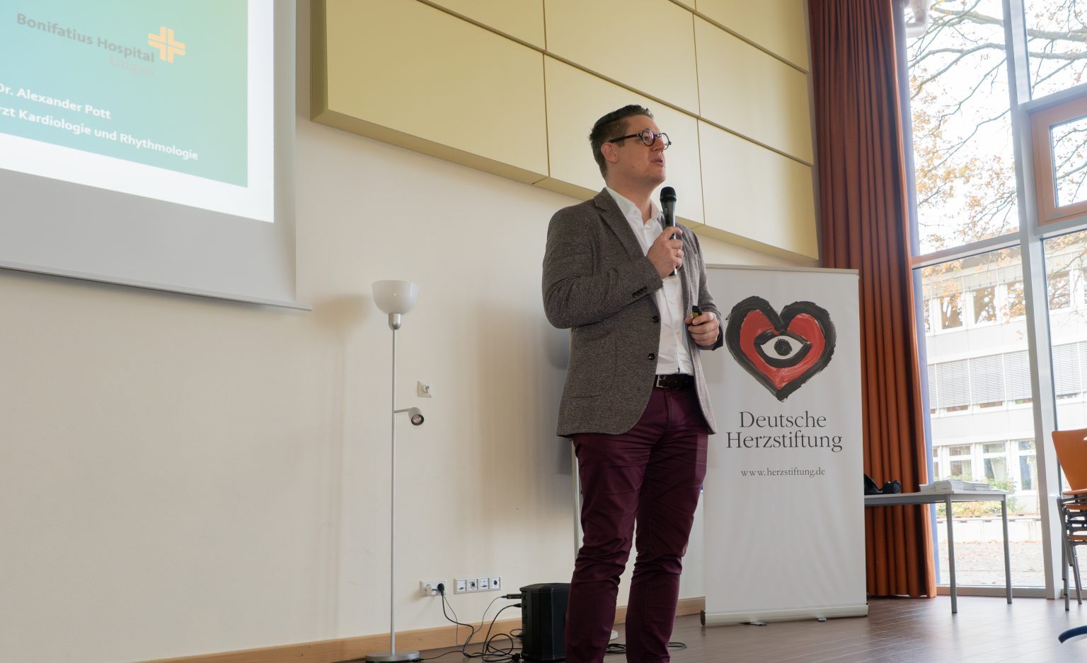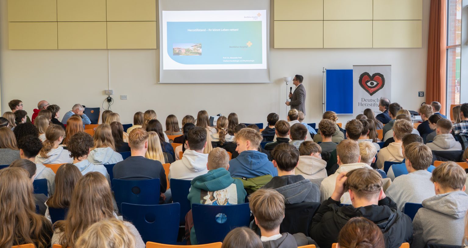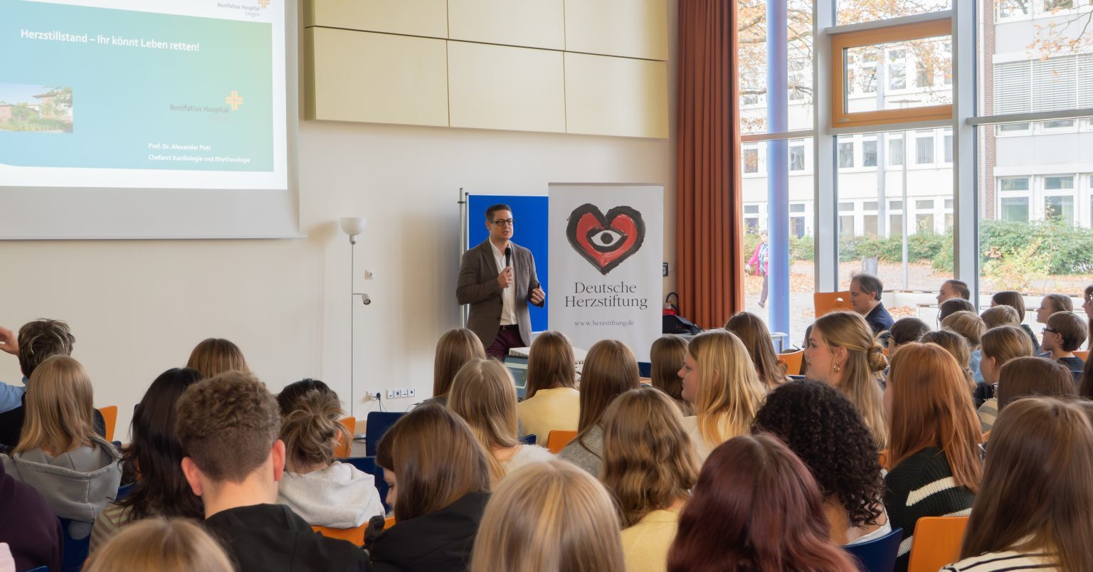 Herr Prof Dr. Alexander Pott, Chefarzt der Kardiologie am Bonifatius Krankenhaus in Lingen, eröffnet das Projekt „Herzensretter Bronze“ am Gymnasium Georgianum Lingen, welches unter der Schirmherrschaft der Deutschen Herzstiftung und in Kooperation mit der DLRG, Ortsgruppe Lingen, in der Praxis umgesetzt wird.